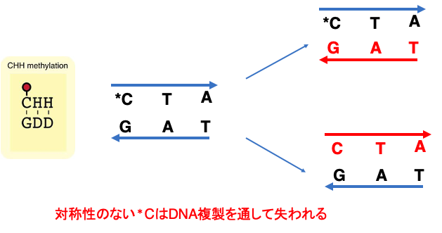 一方でCHHの場合,娘鎖に親鎖の対象点にCは現れません。従って,CHH内のメチル化はDNA,DNA複製を通して失われやすいメチル化修飾と言えます。