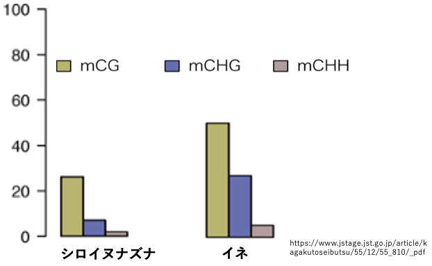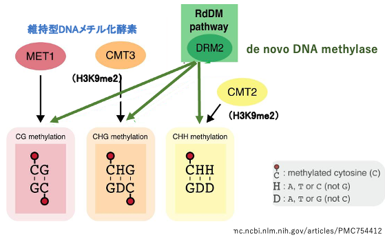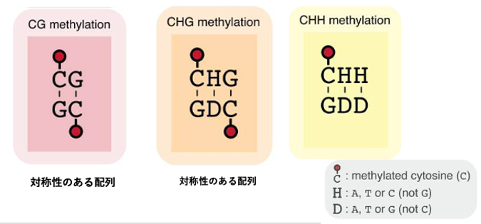 動物のゲノムに見られるメチル化はCG配列のCのメチル化ですが,裸子植物や被子植物ではCHGやCHH配列内のCにもメチル化修飾が見られます。ここでHはA,T,またはC (not G)を示しています。