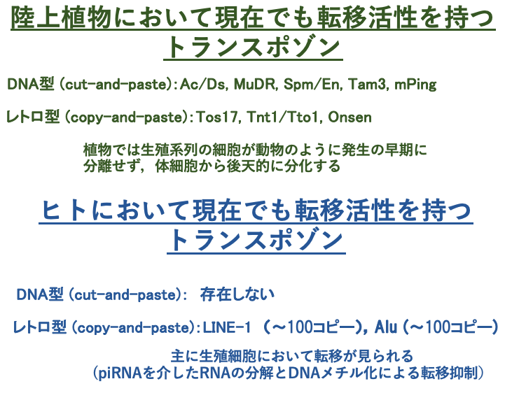 陸上植物でRdDMが進化した理由として,陸上植物では転移活性のあるトランスポゾン種も,またそれらのコピー数も多い事が考えられます。