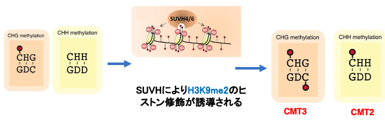 CHG配列の対象点にあるCはその配列周辺にあるヒストンがH3K9me2の修飾を受けている場合は,維持型DNAメチル化酵素であるCMT3が活性化されて効率良くメチル化されます。一方,CHHのCにメチル化修飾がない場合でも,同様にヒストンがH3K9me2の修飾を受けている場合は,CMT2によりメチル化修飾を受けることがあります。
