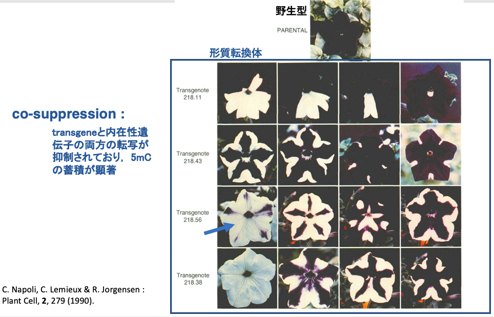 解析の結果,花弁の白い部分では,transgeneと,それに相同な塩基配列をもつ内在性CHS遺伝子の両者に由来するmRNA が現象している事が明らかになりました。transgeneと内在性遺伝子の両方の転写が抑制されることで白色の花弁が現れた事が分かりました。そのため,この現象はco-suppressionと呼ばれました。