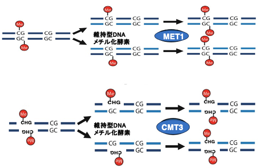 CG配列の場合,維持型DNAメチル化酵素のMET1は,親鎖mCGの対象点にある新生鎖内のCにメチル化修飾を導入します。その結果,DNA複製後も複製前と同様に両方の鎖においてCのメチル化修飾はDNA複製後も維持されることになります。CHG配列の場合は維持型DNAメチル化酵素であるCMT3により,娘鎖の Cがメチル化される場合がありますが,CMT3が働くためにはある条件があります。