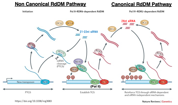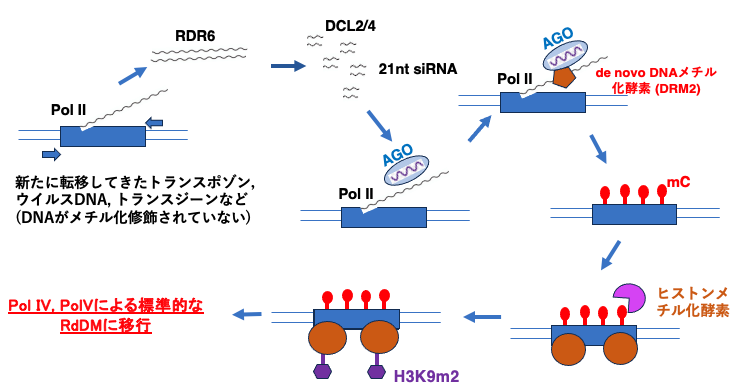 新しく侵入したトランスポゾンがPol IIにより転写されると、その一部はRDR6によってdsRNAに変換され、DCL2やDCL4により21または22 nt長のsiRNAが生成されます。これらはAGO1を介してPost Transcriptional Gene Silencing (PTGS)を誘導しますが、このdsRNAの一部はAGO2に取り込まれます。活性化されたAGO2は,Pol II (またはPol V)の転に付着し,de novo DNAメチル化酵素であるDRM2を呼び込み,DRM2が5mCを周辺配列に導入します。この初期メチル化がPol IV /Pol Vをリクルートし、標準的なRdDM経路にるCのメチル化が進行します。標準的なRdDM経路の場合は,siRNAは24 ntが作られます。