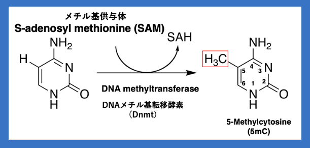 RdDMによるDNAのメチル化修飾というのは C塩基のメチル化修飾を指します。C塩基の5位にある炭素に結合しているHがメチル基に置換されます。この時のメチル基の供与体はS-adenosyl methionine (SAM)です。