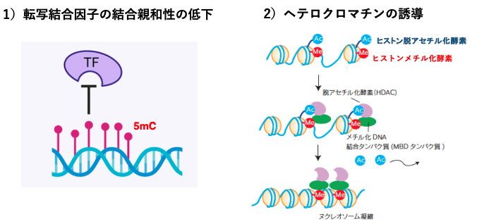5mCが遺伝子の転写開始を抑制するメカニズムは2系統あると考えられます。一つ目の機構は