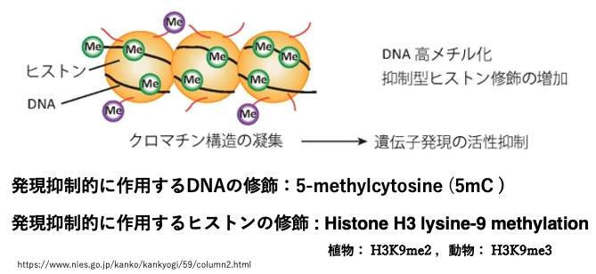植物においてロマチン凝集に関わる代表的なヒストン修飾としては, H3ヒストンの9番目のアミノ酸であるリシン(K)に2個のメチル基を導入されたH3K9me2あります。一方,動物では,遺伝子発現を抑制するヒストン修飾の代表例として,リシンが3個のメチル化修飾を持つH3K9me3があります。