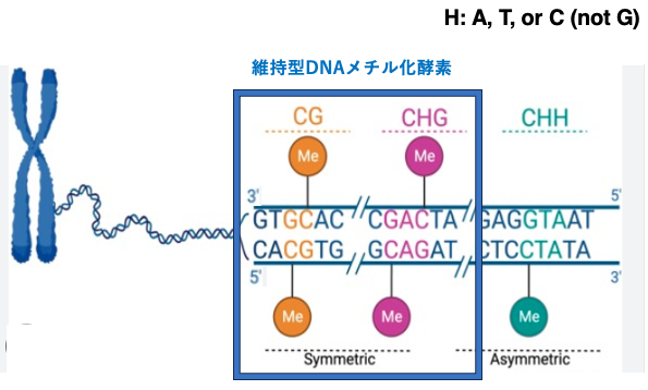 CGとCHG(H=A, T, C, not G)は2本鎖DNAを考えた場合,Cの位置に関して対称性のある配列ですが,CHHではその相補鎖にはCが含まれません。