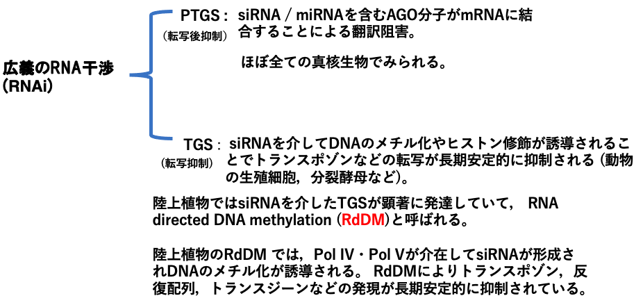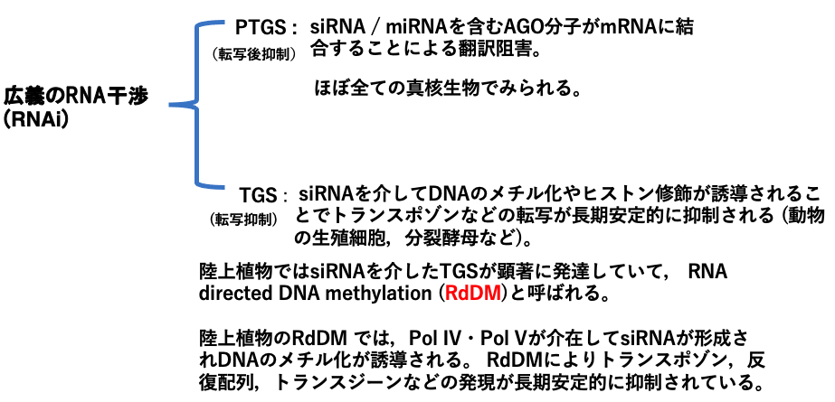 陸上植物で見られるRNAiによるTGSは、特にRNA dependent DNA Methylation, RdDMと呼ばれています。RdDMにより植物ゲノム中のトランスポゾンや反復配列,外来ウイルスなどの有害な遺伝的な因子の転写が長期安定的に抑制されています。この動画では陸上植物のRNA dependent DNA Methylationの機構について解説しています。